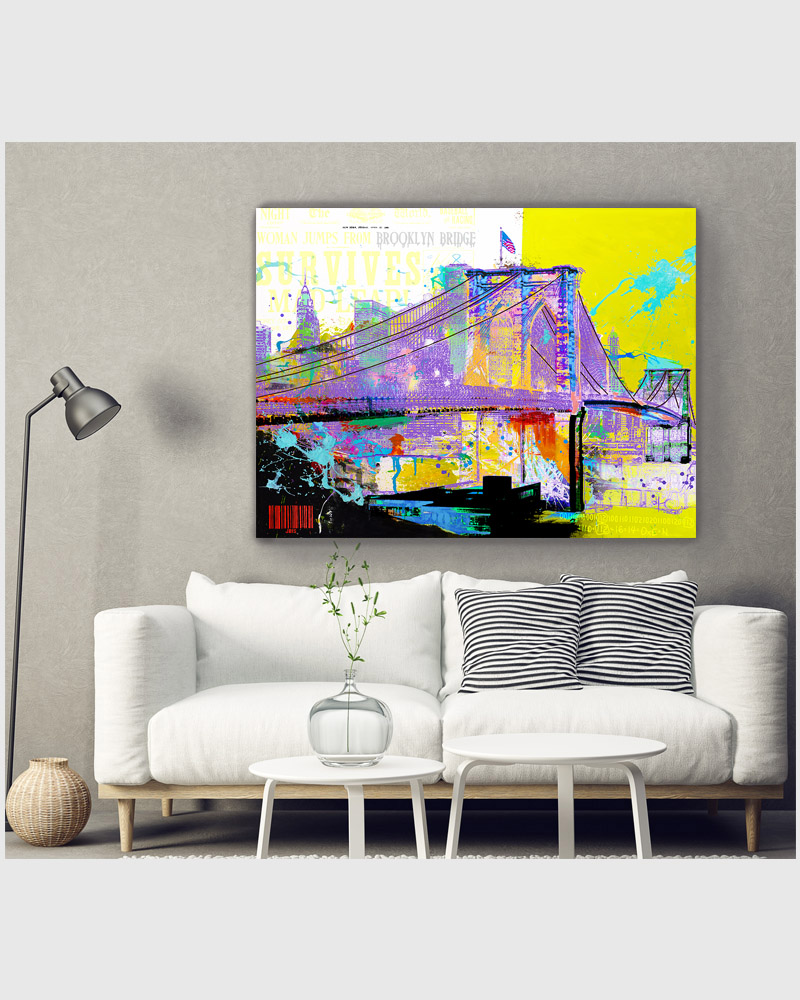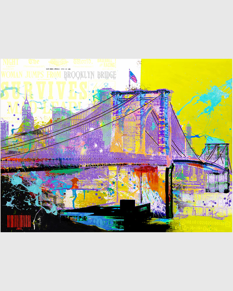 “BROOKLYN BRIDGE” 48 by 36 inches, acrylic - mixed media & GD on canvas mounted to hardpanel coated in resin (2020)